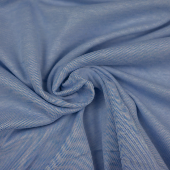 Összetétel: 90% pamut, 10% elasztán. Világoskék színű, rugalmas piqué szövet egy sokoldalú és rugalmas anyag, amely főként pamutból áll, így fokozott kényelmet és kiváló légáteresztő képességet biztosít. Az anyag rugalmassága ideális olyan ruhadarabok készítéséhez, amelyeknek szükségük van némi rugalmasságra, mint például pólók, nadrágok és fehérneműk. Az összetételben található pamut biztosítja a puha és kellemes tapintást, ugyanakkor könnyen kezelhető és kopásálló.